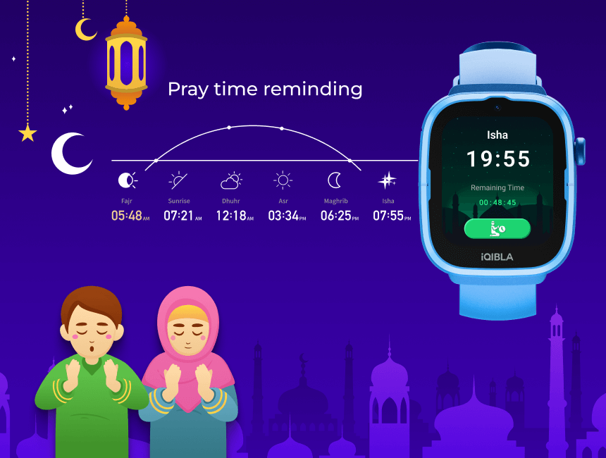 The watch automatically reminds children to performtheir five daily prayers, ensuring they don't missthese important religious activities. This featurehelps children develop a consistent prayer routineand strengthens their religious awareness.