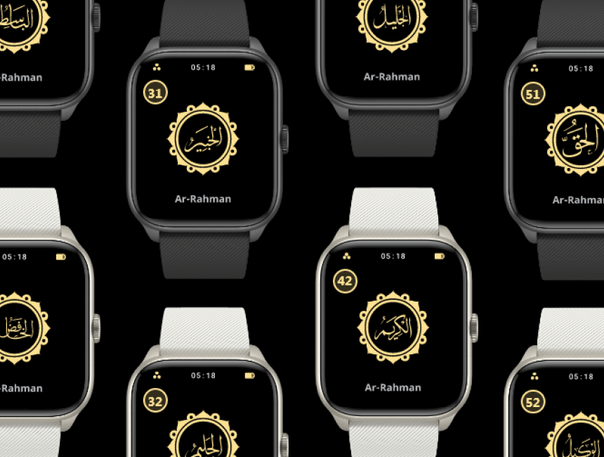 The Quran Watch displays the 99 Names of Allah, along with the meaning of each, enriching your spiritual journey.